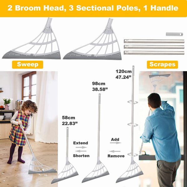 • The package comes with 2 squeegee head and 3 sectional poles. Easy to assemble in a minute. The handle with a fixed clasp to make the floor squeeze more solid and no shaking when using. The sweeper broom is washable and can be used indoors & outdoors. It can be used not only for floor cleaning but also for cleaning windows, which will bring you surprising results.